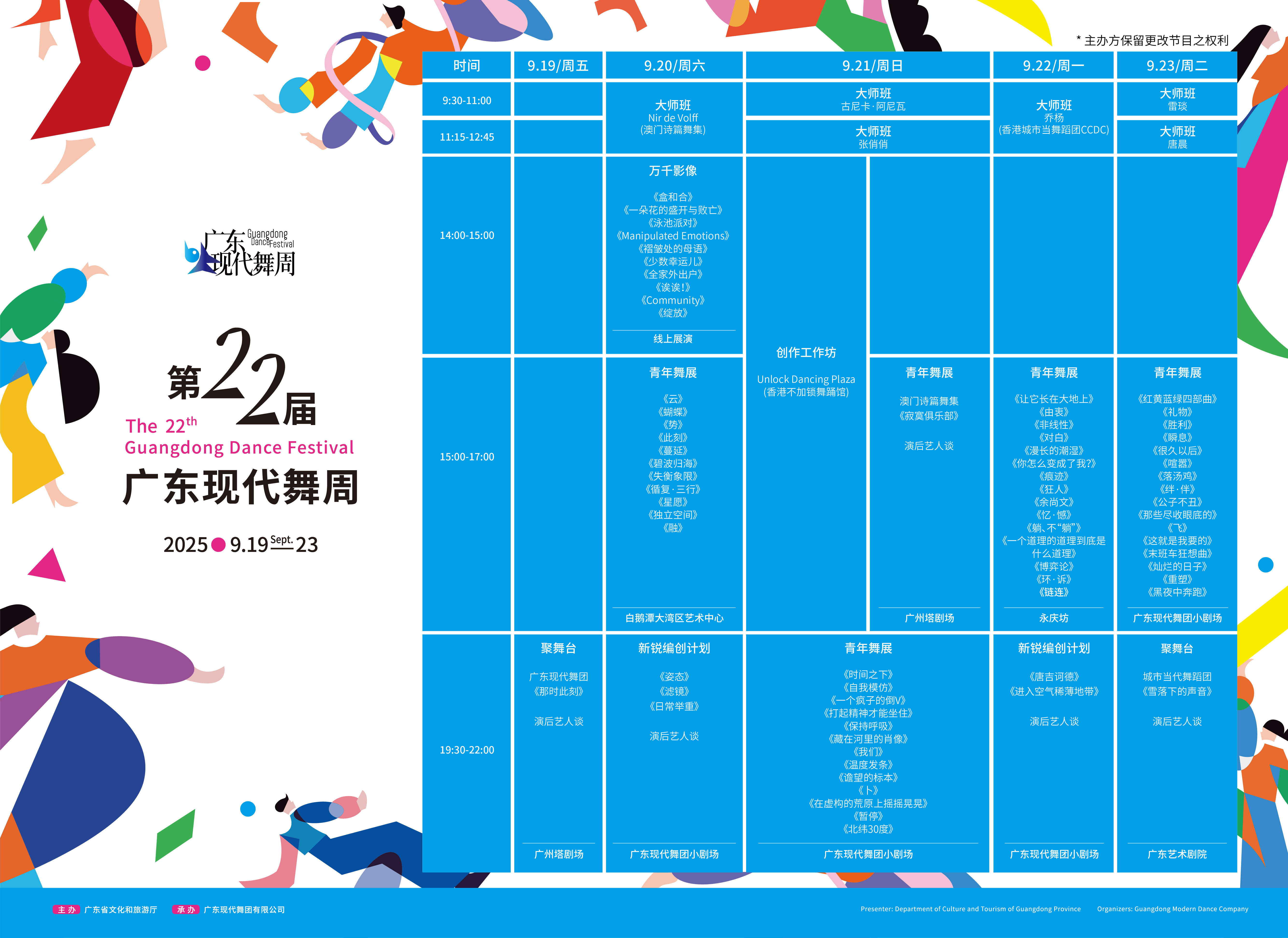 9月19日至23日,第二十二届广东现代舞周将以“湾区汇舞,艺启未来”为主题,在广州掀起一场跨越五天的现代舞艺术盛宴。恰逢第十五届全国运动会即将在粤港澳大湾区举办的重大契机,本届舞周通过「聚舞台」「青年舞展」「新锐编创计划」「大师班」四大板块,集中呈现10台72部精彩作品,以现代舞的艺术形式预热第十五届全国运动会,展现大湾区文化艺术的活力与创新,打造一场艺术与城市对话的文化盛事。